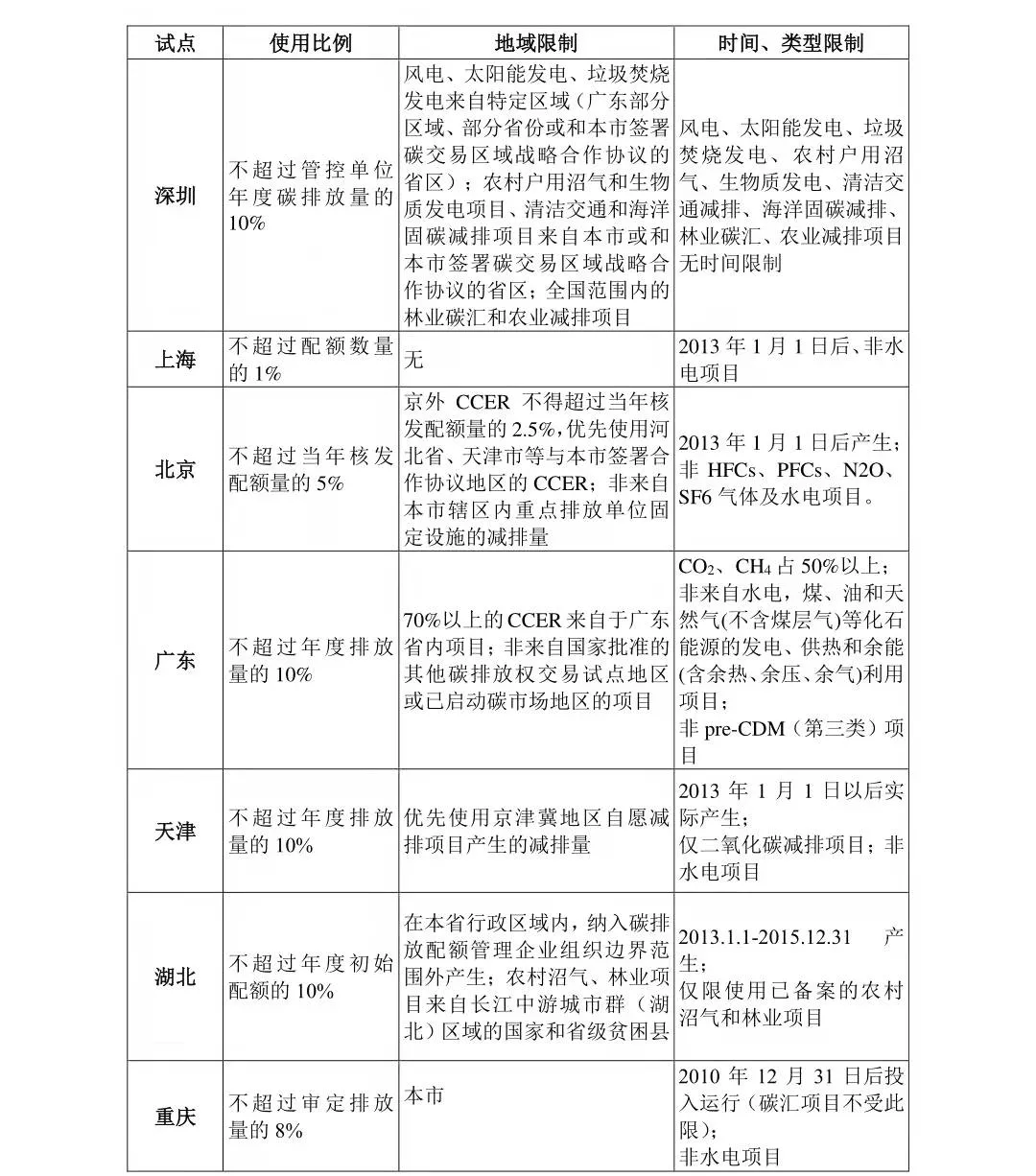 根據(jù)2014年國家發(fā)展改革委公布的《碳排放權(quán)交易管理暫行辦法》,重點排放單位可按照有關(guān)規(guī)定,使用國家核證自愿減排量抵消其部分經(jīng)確認的碳排放量。由于 CCER 的價格往往低于配額的價格,因此購買 CCER 抵消自身排放可以降低配額履約成本。但是,試點碳市場針對使用 CCER 抵消履約在使用比例、來源地區(qū)、年份、項目類型等方面作出了規(guī)定,并隨著不同年份進行調(diào)整,使用的 CCER 量僅占配額的一部分,因此購買減排量抵消自身排放的方式僅是完成配額履約的一種有效補充方式。下表是各試點地區(qū)對 CCER 使用量的規(guī)定: